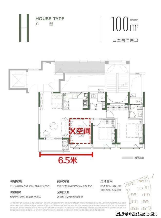 H户型是难得一见的四开间朝南、全明户型层高3.2米,阳光充沛,整盘仅15套!公共区域电梯门侧对单元门,隐私性更强!动静分离,生活起居互不打扰;延续竖厅餐厅/客厅分区功能明确;客厅相邻卧室的墙体未来二次装修可变X空间,打通能拥有面宽约6.5米的超大尺度横厅;主卧套间进门处未来可做整面储物柜,收纳空间Max!很适合年轻家庭居住,尺度感也是足够的!