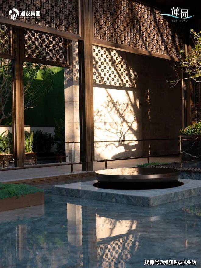 风雨连廊串联中央景观轴,以石材、金属、水景构建起曲径通幽的意境,随处可见的莲花造型,寄托浦发「步步生莲」的祝愿,让业主归家一路美好相随.